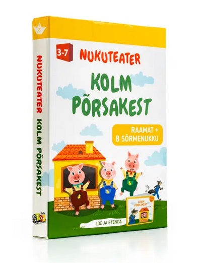 Karbis on raamat klassikalise muinasjutuga ja kaheksa kartongist tegelaskuju. Loe läbi „Kolme põrsakese“ muinasjutt ja kasuta tegelasi oma lemmikstseenide etendamiseks. Põrsakesed ärkavad lapse sõrmedel ükshaaval ellu ja kuri hunt tuleb pahandust tekitama. Lisaks saad igale põrsakesele oma maja ehitada.