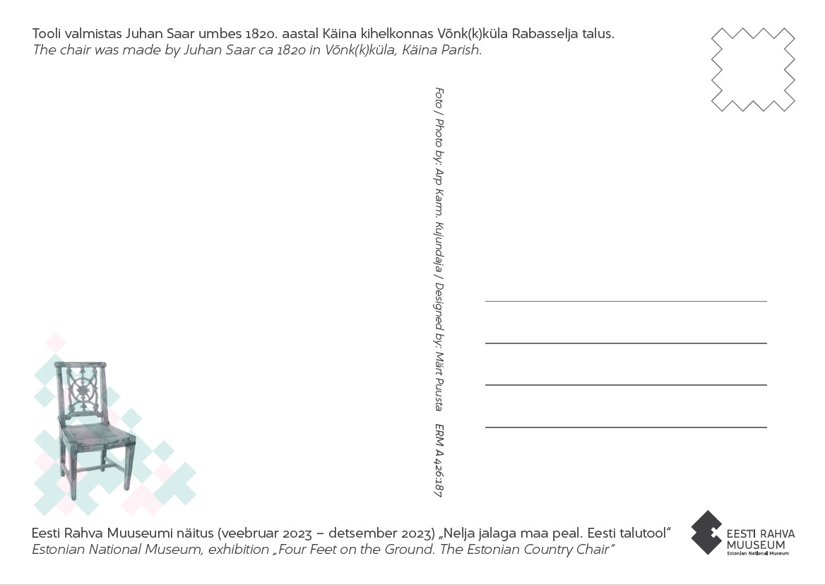Postkaart ilmus seoses Eesti Rahva Muuseumi näitusega “Nelja jalaga maa peal. Eesti talutool”.