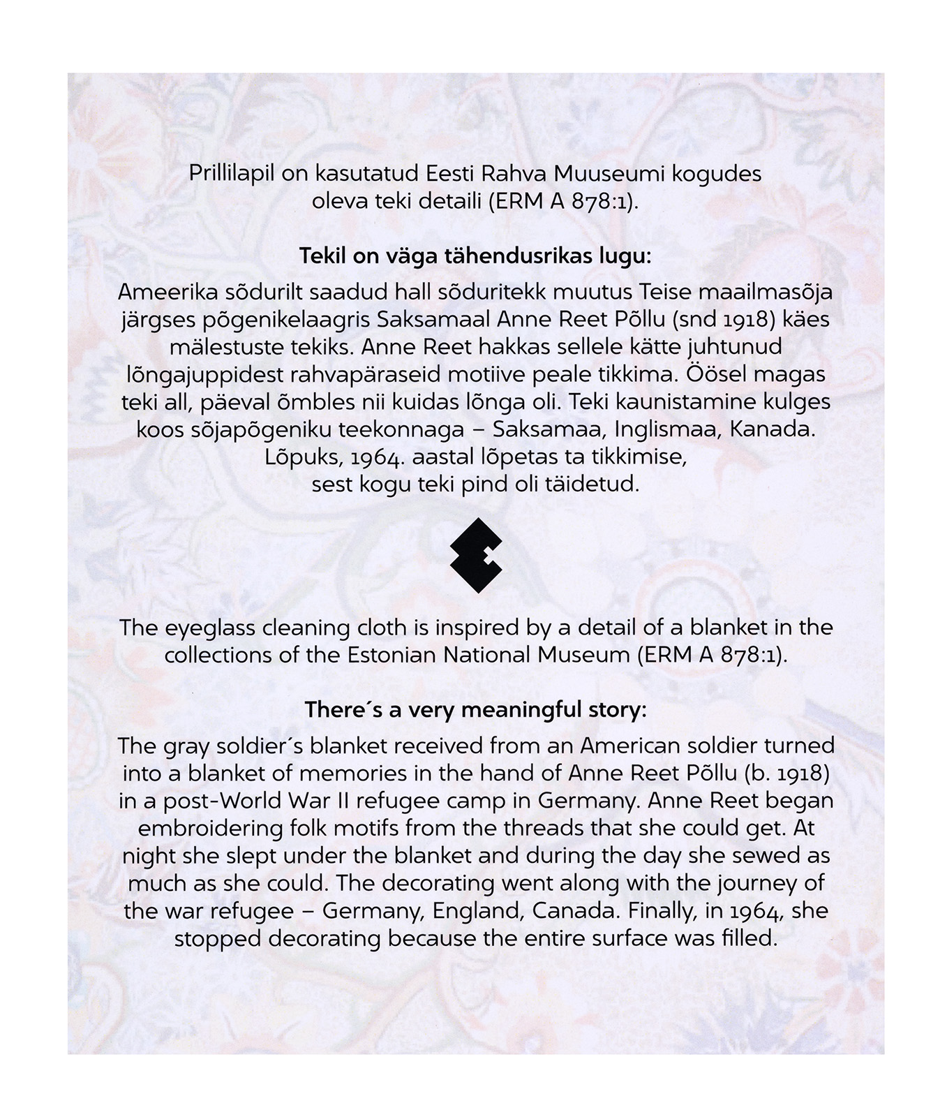 Prillilapil on kasutatud Eesti Rahva Muuseumi kogudes oleva teki detaili (ERM A 878:1).