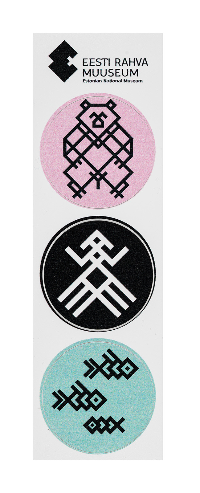 Kolm ümmargust kleepsu 13 x 4 cm paberil. Sümbolid on pärit soome-ugri püsinäitusest “Uurali kaja”.