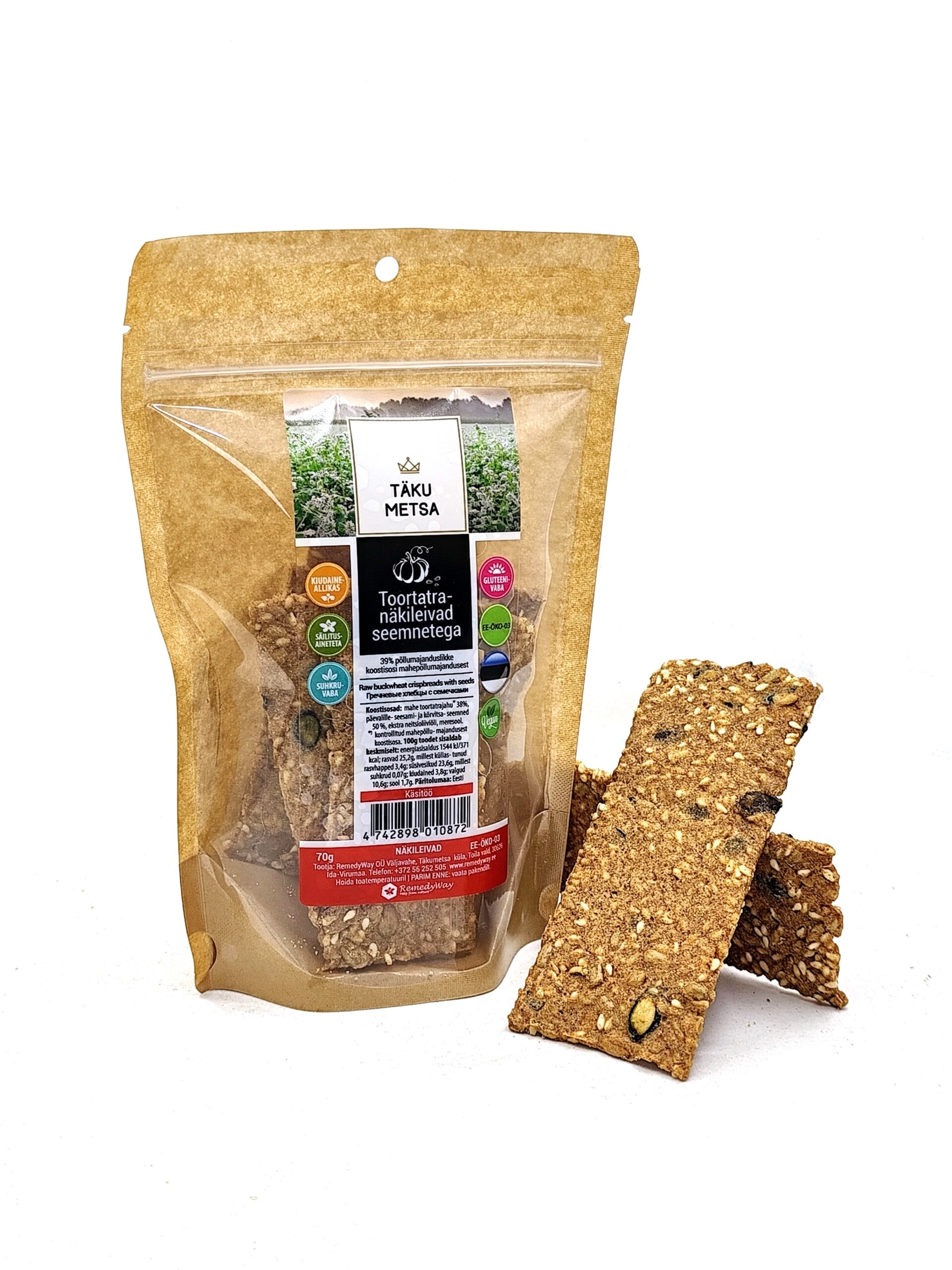 Tervislik ja maitsev käsitööna valmistatud gluteenivaba snäkk. Eesti mahetoortatrajahust ja toitainerikastest seemnetest valminud näkileivad on krõbedad ja toitvad. Ideaalne tervislikuks vahepalaks, suupisteks või dipikastmega nautimiseks. Sobib teadlikule tarbijale, kes hindab kvaliteeti ja puhast koostist.