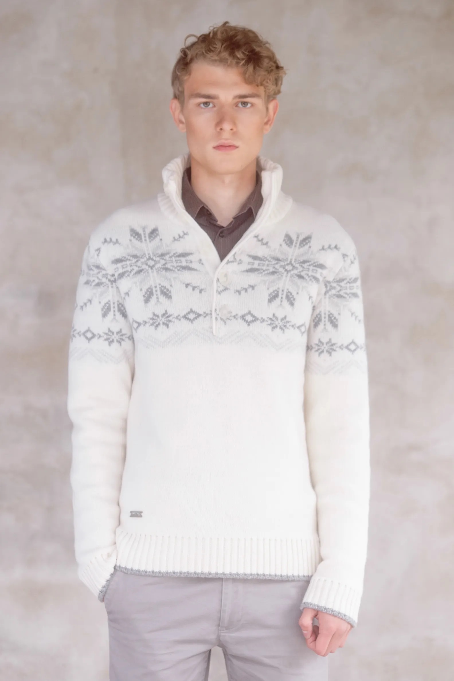 Kõrge krae ja nööbikinnisega pehme täisvillane loodusvalge meeste kampsun. Kampsun on kootud kahekordse koega, mis teeb ta mõnusalt pehmeks. Nööbikinnis on viie nööbiga. Varrukasuu ja allääre otsa laiem triip on kootud praktilise halli värviga.