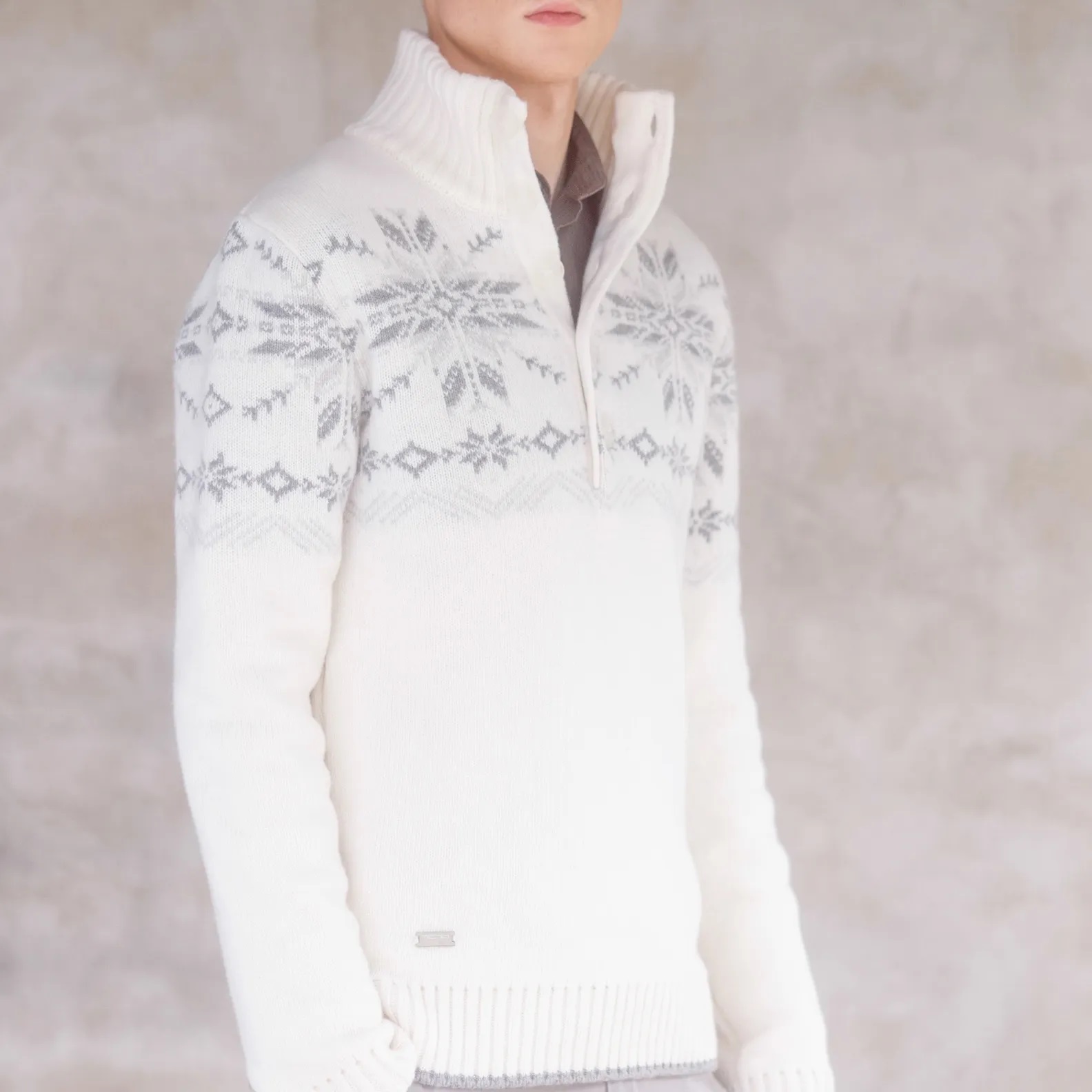 Kõrge krae ja nööbikinnisega pehme täisvillane loodusvalge meeste kampsun. Kampsun on kootud kahekordse koega, mis teeb ta mõnusalt pehmeks. Nööbikinnis on viie nööbiga. Varrukasuu ja allääre otsa laiem triip on kootud praktilise halli värviga.