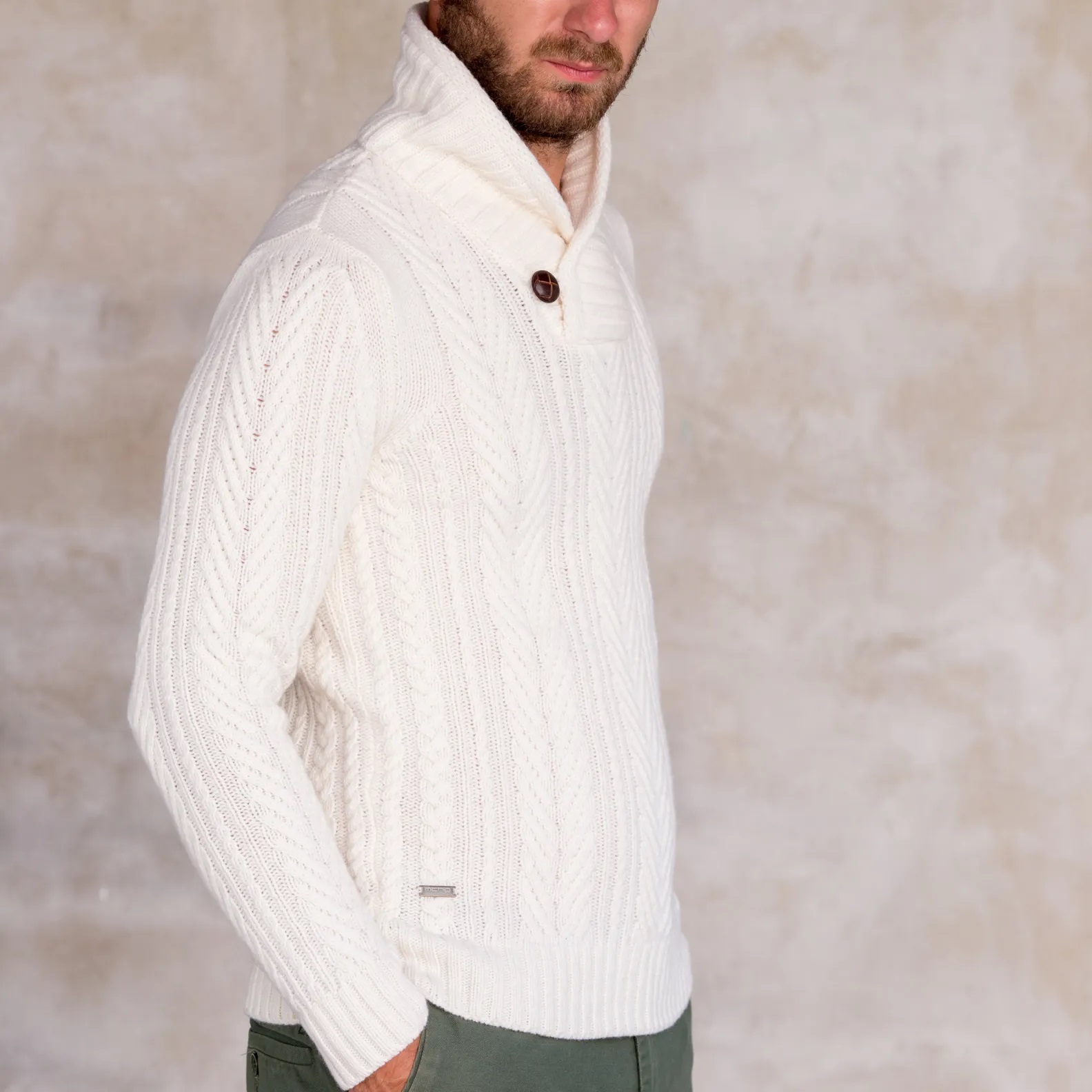 Mõnusalt pehme ja paks klassikalise sallkraega valget värvi kampsun. Heeringasaba mustrit meenutavad palmikute read jooksevad üle terve kampsuni.