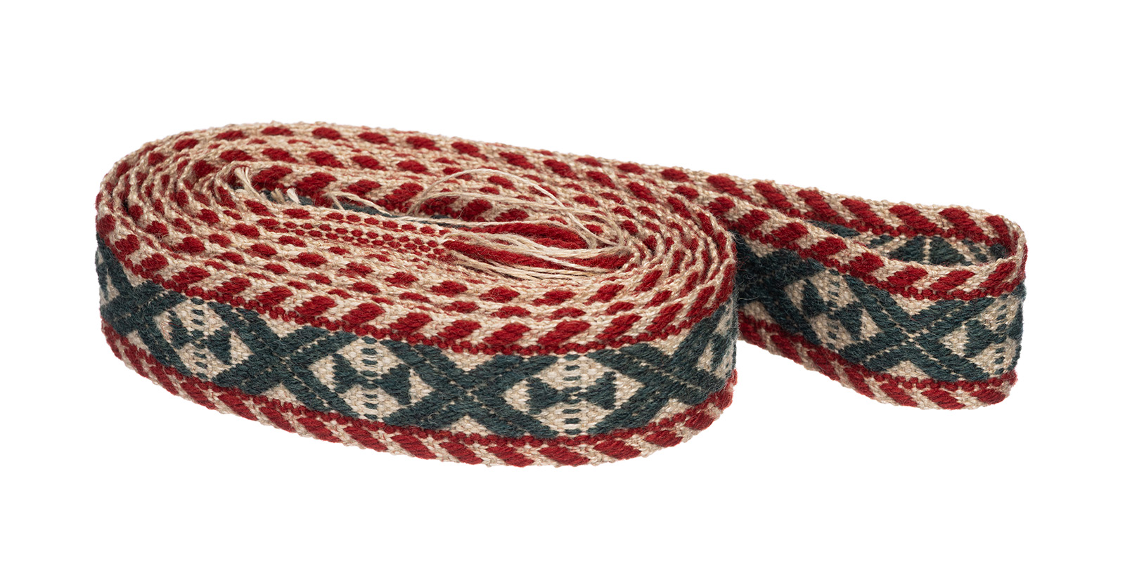 Käsitööna valminud rahvariide vöö. Vöö pikkus on 300 cm ja laius on 3,4 cm.