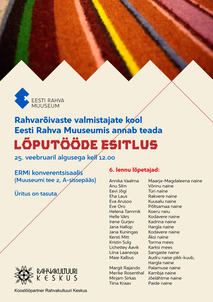 25. veebruaril algusega kell 12.00 toimub lõputööde esitlus ERMi konverentsisaalis (Muuseumi tee 2, A-sissepääs).